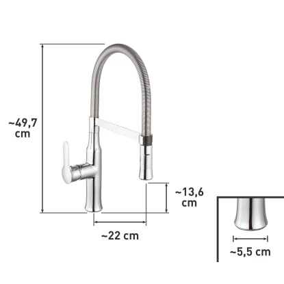 In Kombination mit der 360 °-Schwenkbarkeit und dem flexiblen Brauseschlauch ergibt sich ein maximaler Wirkungsradius. Der Einhebelmischer kann bequem mit nur einer Hand bedient werden. So lassen sich Durchflussmenge und Temperatur des Wassers schnell und einfach regulieren. Die Armatur ist für die Montage auf einer Küchenspüle geeignet. Die benötigte Öffnung im Spültisch beträgt 5,5 cm. Sie ist mit zwei Anschlüssen versehen und verfügt über die benötigten Anschlussschläuche. Darüber hinaus ist im Lieferumfang eine hochwertige Mischdüse sowie eine geprüfte Markenkartusche enthalten. Alle Teile entsprechen den Richtlinien der aktuellen Trinkwasserverordnung.