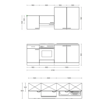 Die 210 cm breite Küchenzeile besteht aus (BxHxT):