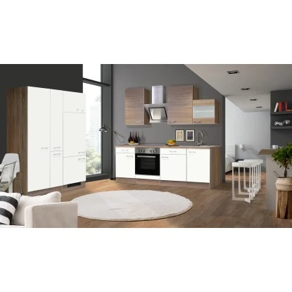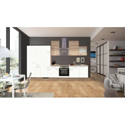 Diese moderne Küche mit einer Gesamtbreite von 360 cm ist ideal für Familien und ambitionierte Hobbyköche und bietet neben der hohen Funktionalität viel Stauraum für Geräte und Vorräte. Die Türen der Schränke sind sowohl für den links- als auch rechtsseitigen Aufbau vorbereitet, was Ihnen ein Höchstmaß an Flexibilität bei der Montage bietet. Die 140 cm breite Einheit aus Geschirr-, Apotheker- und Geräteschrank inkl. Kühlschrank lässt sich individuell stellen und passt sich so den unterschiedlichen räumlichen Gegebenheiten perfekt an. Die hochwertigen und pflegeleichten Kunststofffronten und die stabile Bauweise der Schrankkörper garantieren Ihnen lange Freude an Ihrer Küche. Eine Arbeitsplatte im passenden Design gehört bei unseren Küchenzeilen natürlich immer dazu. Eine gut verständliche Aufbauanleitung sowie sämtliche Beschläge liegen selbstverständlich dabei.