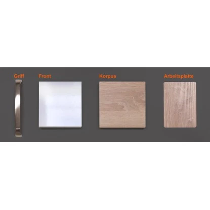 Lieferumfang: Front- und Korpusmuster 16 mm stark, Arbeitsplattenmuster 0,8 mm stark, moderner Bügelgriff