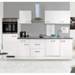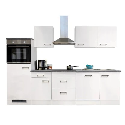 Die 280 cm breite Flex-Well Küchenzeile Joelina zeichnet sich durch geradliniges Design, hohe Funktionalität und stabile Bauweise aus. Mit ihren modernen Elektrogeräten und den zahlreichen Küchenschränken ist sie die ideale Küche für kleine bis mittelgroße Familien.