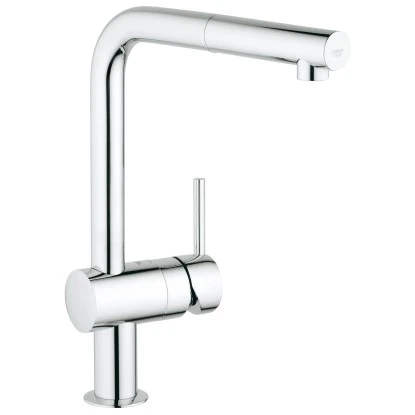 Die Grohe Minta Küchenarmatur verfügt über einen eleganten L-förmigen Schwenkauslauf und eine komfortable, herausziehbare Spülbrause. Mit ihrem L-förmigen Auslauf, der bis zu vollen 360° schwenkbar ist, wird das Reinigen der Spülen oder das Befüllen großer Töpfe sehr unkompliziert. Die herausziehbare Spülbrause der Armatur ergänzt den Bedienradius für weiteren Reinigungskomfort.
