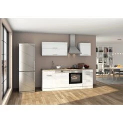 Die Serie Mailand zeichnet sich durch die hochglänzende MDF-Front, attraktiven Metallgriffen sowie der pflegeleichten Korpus-Kunststoffoberfläche aus. Die Schränke innen sind in Weiß gehalten. Zusätzlich findet sich hier eine Arbeitsplatte im Eiche Dekor ohne Ausschnitt für einen variablen Einsatz der Spüle.