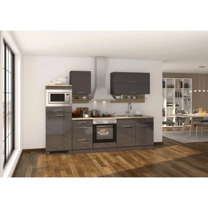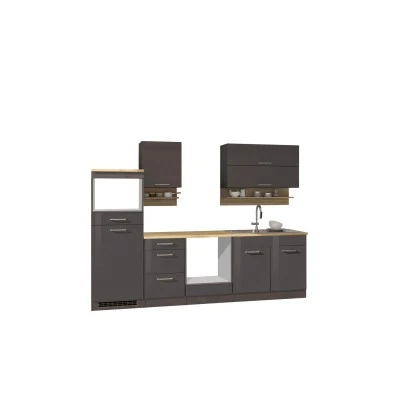 Die Serie Mailand zeichnet sich durch die hochglänzende MDF-Front, attraktiven Metallgriffen sowie der pflegeleichten Korpus-Kunststoffoberfläche aus. Die Schränke innen sind in Weiß gehalten. Zusätzlich findet sich hier eine Arbeitsplatte im Eiche Dekor ohne Ausschnitt für einen variablen Einsatz der Spüle.