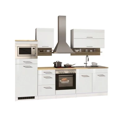 Die Serie Mailand zeichnet sich durch die hochglänzende MDF-Front, attraktiven Metallgriffen sowie der pflegeleichten Korpus-Kunststoffoberfläche aus. Die Schränke innen sind in Weiß gehalten. Zusätzlich findet sich hier eine Arbeitsplatte im Eiche Dekor ohne Ausschnitt für einen variablen Einsatz der Spüle.