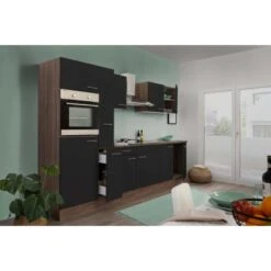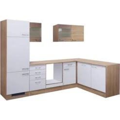 Die Serie Mailand zeichnet sich durch die hochglänzende MDF-Front, attraktiven Metallgriffen sowie der pflegeleichten Korpus-Kunststoffoberfläche aus. Die Schränke innen sind in Weiß gehalten. Zusätzlich findet sich hier eine Arbeitsplatte im Eiche Dekor ohne Ausschnitt für einen variablen Einsatz der Spüle.