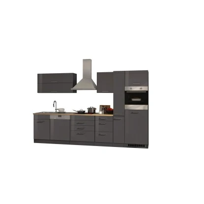Die Serie Mailand zeichnet sich durch die hochglänzende MDF-Front, attraktiven Metallgriffen sowie der pflegeleichten Korpus-Kunststoffoberfläche aus. Die Schränke innen sind in Weiß gehalten. Zusätzlich findet sich hier eine Arbeitsplatte im Eiche Dekor ohne Ausschnitt für einen variablen Einsatz der Spüle.