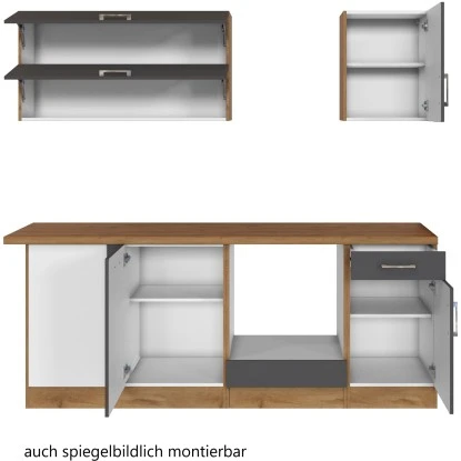 Die Küchenzeile wird Ihnen zerlegt und ohne Dekoration bis zu Ihrer gewünschten Verwendungsstelle geliefert. Die Anordnung der Küchenelemente und die Anschläge der Türen sind somit für Sie frei wählbar. Die Arbeitsplatte wird ohne Ausschnitte geliefert. Technische Änderungen und Irrtümer vorbehalten