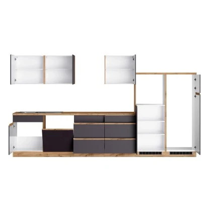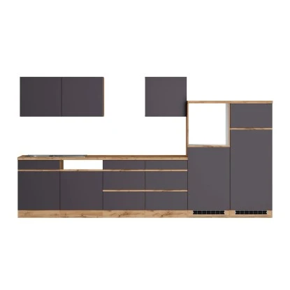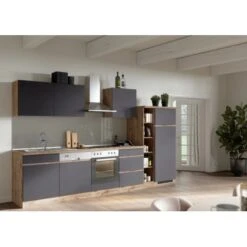 Die Küchenzeile Turin von Held Möbel mit hochwertigen MDF-Fronten begeistert optisch durch die klaren Linien sowie die zweifarbige Gestaltung. Da die Schränke in zwei Farbkombinationen verfügbar sind, können Sie die Küche im Mix-and-Match Stil erweitern. Zusätzliche Akzente werden durch die 38 mm starke Arbeitsplatte im Beton Dekor gesetzt.