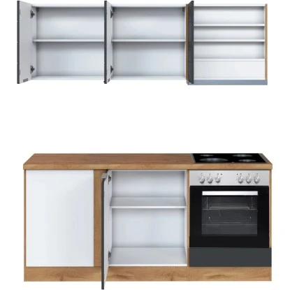 Die Küchenzeile wird Ihnen zerlegt und ohne Dekoration geliefert. Die Anordnung der Küchenelemente und die Anschläge der Türen sind somit für Sie frei wählbar. Die Arbeitsplatte wird ohne Ausschnitte geliefert. Technische Änderungen und Irrtümer vorbehalten