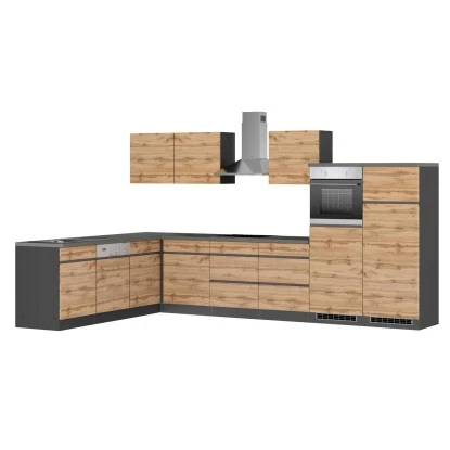 Die Winkelküche Turin von Held Möbel mit hochwertigen MDF-Fronten begeistert optisch durch die klaren Linien sowie die zweifarbige Gestaltung. Da die Schränke in zwei Farbkombinationen verfügbar sind, können Sie die Küche im Mix-and-Match Stil erweitern. Zusätzliche Akzente werden durch die 38 mm starke Arbeitsplatte im Beton Dekor gesetzt.