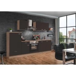 Die Küchenzeile Artisan Classic 280 cm in Lava Matt überzeugt mit zeitloser Optik und durch ein unschlagbares Preis-Leistungsverhältnis. Die Küche besticht insbesondere durch die Kombination aus Design, Funktion und Robustheit. Sie besteht aus Kühlschrank mit ***Gefrierfach, Edelstahl-Herd mit Backofen und Dunstabzugshaube, Geschirrspüler vollintegriert, Spüle mit Unterschrank, einem weiteren Unterschrank mit Schublade, einer Schublade unter dem Kühlschrankumbau und Hängeschränken. Die Arbeitsplatte wird ohne Ausschnitte in einer Stärke von 38 mm geliefert.