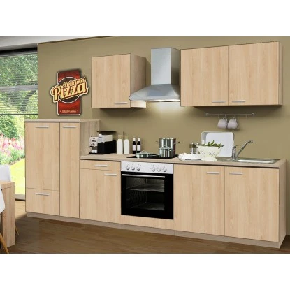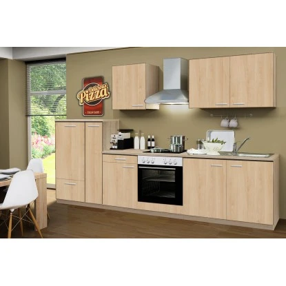 Die Küchenzeile Classic mit einer Breite von 300 cm überzeugt mit zeitloser Optik und ein unschlagbares Preis-Leistungsverhältnis. Die Küche besticht insbesondere durch die Kombination aus Design, Funktion und Robustheit. Alle Möbelteile werden in Deutschland gefertigt und zeichnen sich durch hochwertige Qualität aus. Die teilweise mit Schubladen ausgestatteten Unterschränke, die Hängeschränke und der Apothekerschrank bieten viel Stauraum für Ihre Küchenutensilien. Zudem sorgen die modernen Elektrogeräte für hohen Komfort beim Kochen. Die Küchenzeile besteht aus Kühlschrank mit 3-Sterne-Gefrierfach, Edelstahl-Herd mit Backofen und Dunstabzugshaube, Spüle mit Unterschrank, einem weiteren Unterschrank mit Schublade, einer Schublade unter dem Kühlschrank, Apothekerschrank und Hängeschränken. Die Arbeitsplatte wird ohne Ausschnitte in einer Stärke von 28 mm geliefert.