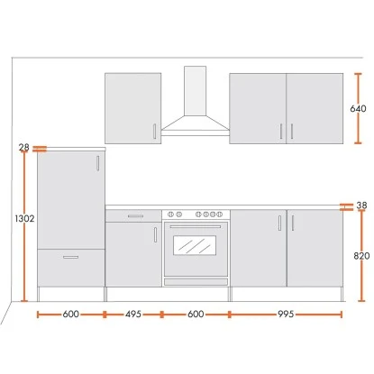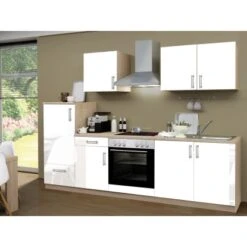 Die Küchenzeile Premium mit einer Breite von 270 cm überzeugt mit zeitloser Optik und ein unschlagbares Preis-Leistungsverhältnis. Die Küche besticht insbesondere durch die Kombination aus Design, Funktion und Robustheit. Alle Möbelteile werden in Deutschland gefertigt und zeichnen sich durch hochwertige Qualität aus. Die teilweise mit Schubladen ausgestatteten Unterschränke und die Hängeschränke bieten viel Stauraum für Ihre Küchenutensilien. Zudem sorgen die modernen Elektrogeräte für hohen Komfort beim Kochen. Die Küchenzeile besteht aus Kühlschrank mit 3-Sterne-Gefrierfach, Edelstahl-Herd mit Backofen und Dunstabzugshaube, Spüle mit Unterschrank, einem weiteren Unterschrank mit Schublade, einer Schublade unter dem Kühlschrank und Hängeschränken. Die Arbeitsplatte wird ohne Ausschnitte in einer Stärke von 38 mm geliefert.