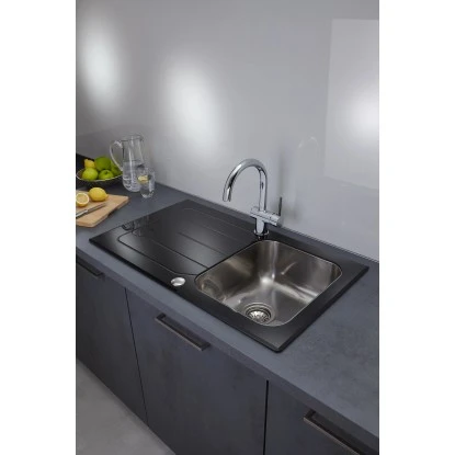 Die OBI Einbauspüle Quadra Basic 86 GL ist eine schwarze eckige Glasspüle mit Ablauf und Abtropffläche. Das Spülbecken besteht aus Edelstahl. Sie besticht durch modernes Design und hochwertige Verarbeitung. Die Spüle ist geeignet für Unterschränke ab 50 cm Breite. Die wichtigsten Vorteile im Überblick:
