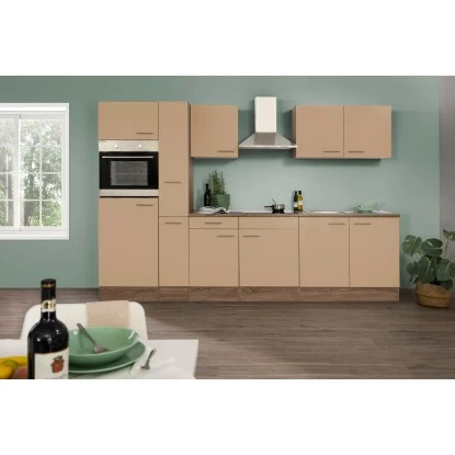 Die Respekta Küchenzeile ist mit einer Breite von 300 cm die ideale Küche für Familien, Paare und Wohngemeinschaften. Ihr Korpus in Eiche York Optik sowie die Seidenglanzfronten in der Farbe Cappuccino machen die Küche zu einem Blickfang. Drei Oberschränke, ein großer Apothekerschrank sowie Unterschränke und Schubladen bieten viel Stauraum für Ihre Küchenutensilien und Vorräte. Ein Glaskeramikkochfeld, ein Hochbaubackofen, eine Einbaukühlschrank, eine Kaminhaube und eine Einbauspüle komplettieren die Küche.