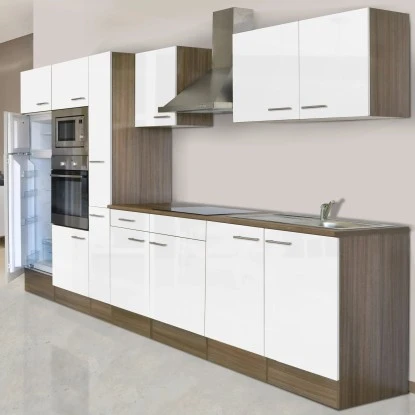 Die Respekta Küchenzeile ist mit einer Breite von 360 cm die ideale Küche für große Familien oder Wohngemeinschaften mit viel Stauraumbedarf. Ihr Korpus in Eiche York Optik sowie die Seidenglanzfronten in den Farben Grau, Vanille und Weiß machen die Küche zu einem Blickfang. Drei Oberschränke, ein extragroßer Apothekerschrank sowie Unterschränke und Schubladen bieten viel Stauraum für Ihre Küchenutensilien und Vorräte. Ein Glaskeramikkochfeld, ein Hochbaubackofen, eine Einbau Kühl-Gefrier-Kombination, eine Kaminhaube und eine Einbauspüle komplettieren die Küche.