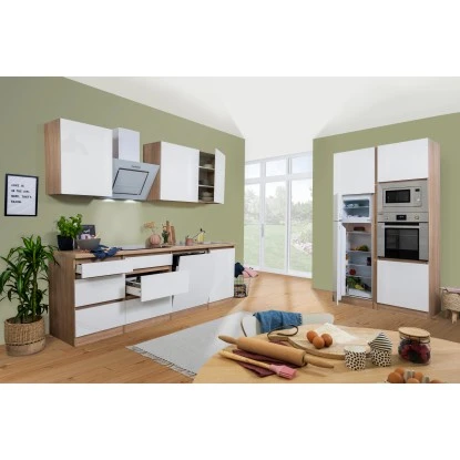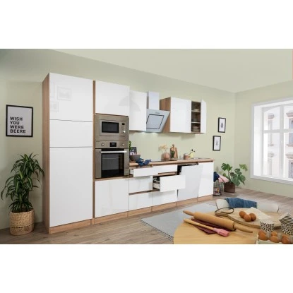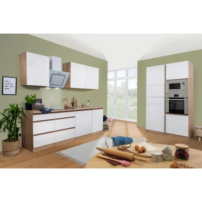 Respekta Premium Küchenzeile Grifflos 345 Cm Weiß Hochglanz-Eiche Sägerau