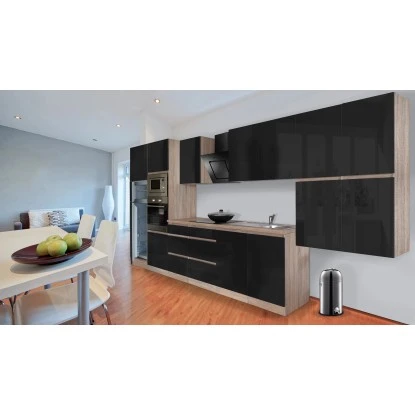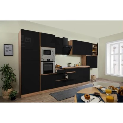 Respekta Premium Küchenzeile Grifflos 435 Cm Schwarz Hochglanz-Eiche Sägerau