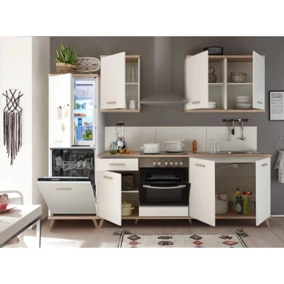 Die Respekta Premium Küchenzeile kombiniert die erfrischenden Farben des skandinavischen Stils mit den markanten Formen des Retro-Designs und avanciert zu einem Blickfang in Ihren Räumen. Die Fronten und Korpusse in Weiß matt werden durch Elemente in Eiche Sägerau akzentuiert. Die Arbeitsplatte, die Griffe und die filigranen, abgeschrägten Füße setzen sich stilsicher ab und verleihen der Küche eine geradlinige, moderne Optik.