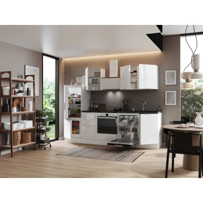 Die Respekta Selection Küchenzeile Elisabeth 280 cm bietet Ihnen alles, was Sie erwarten, um Ihren Traum von einer modernen und funktionalen Küche zu verwirklichen. Mit einer Arbeitshöhe von 91 cm und höhenverstellbaren Sockelfüssen ermöglicht sie Ihnen ein komfortables und ergonomisches Kochen. Dank der Schubkästen und Auszüge mit Vollauszug und Dämpfung, sowie der Glaseinlegeböden bei den Hängeschränken können Sie den Stauraum optimal ausnutzen. Profitieren Sie von der Lieferung fertig montierter Küchenschränke und erhalten Sie eine leistungsstarke und moderne Küchenlösung, die Sie über viele Jahre hinweg begleiten wird.