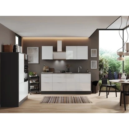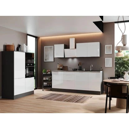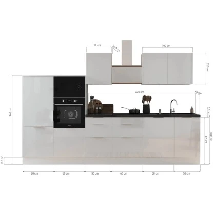 Die Respekta Selection Küchenzeile Elisabeth 340 cm bietet Ihnen alles, was Sie erwarten, um Ihren Traum von einer modernen und funktionalen Küche zu verwirklichen. Mit einer Arbeitshöhe von 91 cm und höhenverstellbaren Sockelfüssen ermöglicht sie Ihnen ein komfortables und ergonomisches Kochen. Dank der Schubkästen und Auszüge mit Vollauszug und Dämpfung, sowie der Glaseinlegeböden bei den Hängeschränken können Sie den Stauraum optimal ausnutzen. Profitieren Sie von der Lieferung fertig montierter Küchenschränke und erhalten Sie eine leistungsstarke und moderne Küchenlösung, die Sie über viele Jahre hinweg begleiten wird.