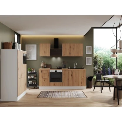 Die Respekta Selection Küchenzeile Elisabeth 340 cm bietet Ihnen alles, was Sie erwarten, um Ihren Traum von einer modernen und funktionalen Küche zu verwirklichen. Mit einer Arbeitshöhe von 91 cm und höhenverstellbaren Sockelfüssen ermöglicht sie Ihnen ein komfortables und ergonomisches Kochen. Dank der Schubkästen und Auszüge mit Vollauszug und Dämpfung, sowie der Glaseinlegeböden bei den Hängeschränken können Sie den Stauraum optimal ausnutzen. Profitieren Sie von der Lieferung fertig montierter Küchenschränke und erhalten Sie eine leistungsstarke und moderne Küchenlösung, die Sie über viele Jahre hinweg begleiten wird.