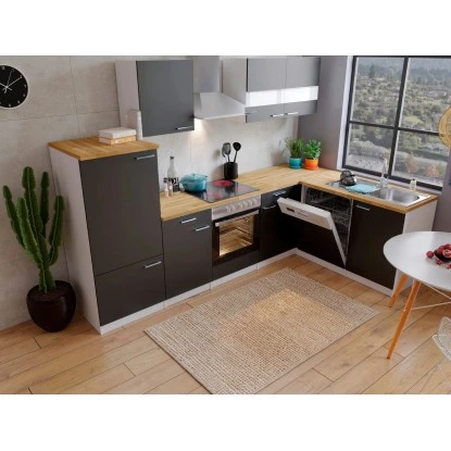 Die Respekta Winkelküche KBL280WSCG ist die ideale Küche für Familien. Der matt-weiße Korpus sowie die schwarzen Fronten machen die Küchenzeile zu einem absoluten Blickfang. Die Arbeitsplatte in Nussbaum Butcher bildet einen schönen Abschluss.